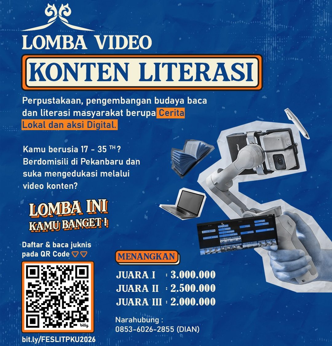Pekanbaru – Pemerintah Kota Pekanbaru melalui Dinas Perpustakaan dan Kearsipan kembali menantang kreativitas anak muda dalam ajang Lomba Video Konten Literasi 2026. Mengangkat tema “Perpustakaan, Pengembangan Budaya Baca, dan Literasi Masyarakat”, ajang ini menjadi panggung buat kamu yang ingin mempromosikan cerita lokal dan aksi digital yang menginspirasi, Selasa (28/4/2026).