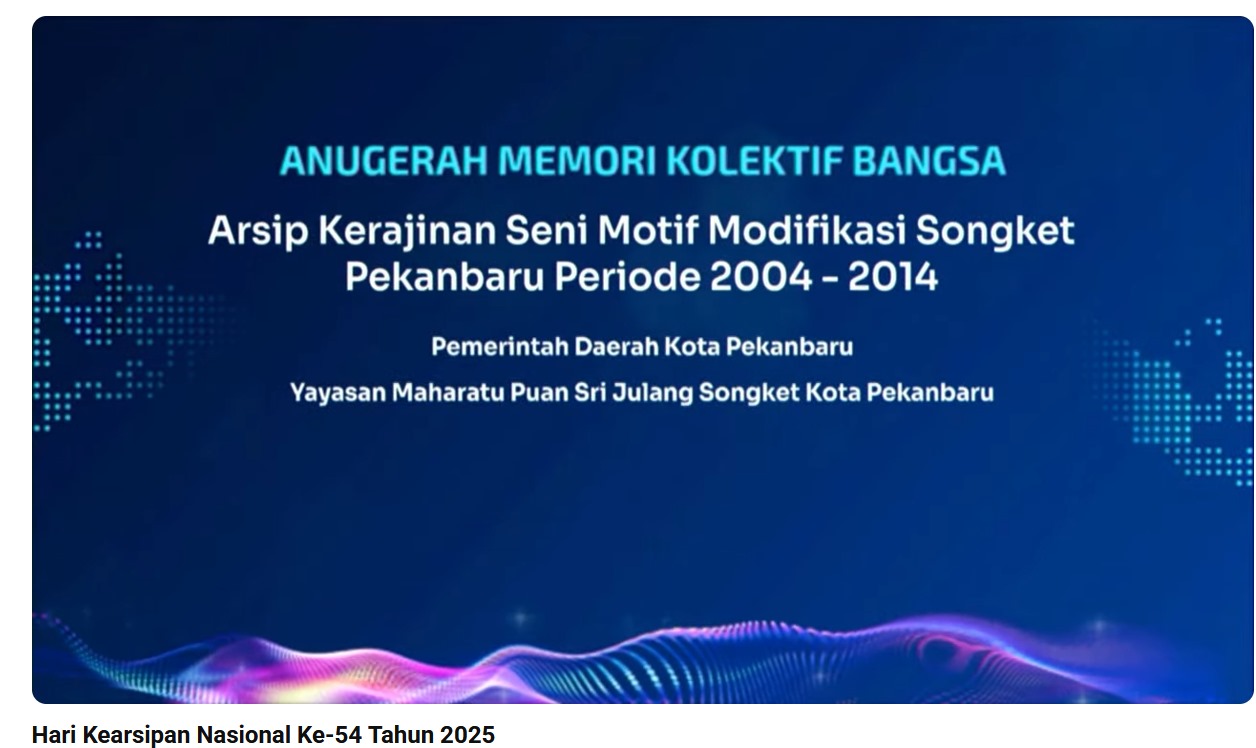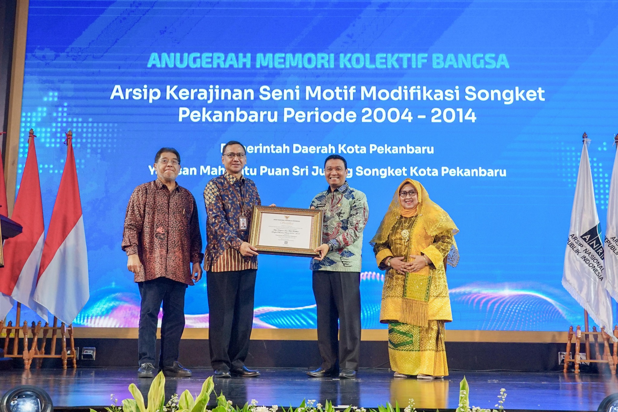 Penghargaan ini diserahkan langsung oleh Kepala ANRI, DR. Mego Pinandito, M.Eng kepada Wakil Wali Kota Pekanbaru, H. Markarius Anwar, S.T., M.Arch, serta Pimpinan Yayasan Maharatu Puan Sri Julang Songket, Hj. Evi Meiroza dalam acara Peringatan Puncak Kearsipan Nasional ke-54 pada Kamis (22/5/2025).