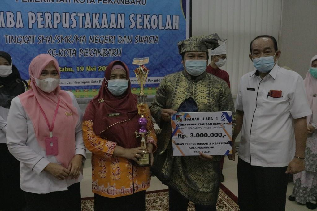 Pekanbaru – Pada Rabu (19/05/2021), Perpustakaan Cahaya Aksara SMAN 5 Pekanbaru dinobatkan oleh Dinas Perpustakaan dan Kearsipan Kota Pekanbaru sebagai juara I dalam ajang lomba perpustakaan SMA/SMK/MA negeri dan swasta se Kota Pekanbaru tahun 2021. Atas prestasi tersebut, SMAN 5 berhak mewakili Pekanbaru ke tingkat provinsi.